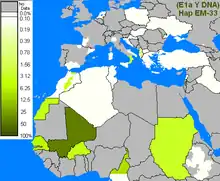 Haplogroup E-M132 also has been found in samples obtained from Moroccan Berbers, Sahrawis, Burkina Faso (including E-M33/M132(xE-M44) in 2/20 = 10% Fulbe and 2/37 = 5.4% Rimaibe[2]), northern Cameroon (including E-M44 in 9/17 = 53% Fulbe and E-M33/M132(xE-M44) in 3/15 = 20% Tali[2]), Senegal (7/139 = 5.0%[9]), Ghana (1/29 = 3% Ga, 1/32 = 3% Fante[3]), Sudan (including 5/32 = 15.6% Hausa and 3/26 = 11.5% Fulani[5]), Egypt (1%[3]-1.4%[10]), Calabria (including both Italian and Albanian inhabitants of the region), Shiite Muslims from Lebanon (3/193 = 1.55%),[11] Syrians (2/202 = 1%),[12] Druze from Lebanon (5/363 = 1.3%),[13] Maronites from Lebanon (2/200 = 1%),[14] an Italian (1/67 = 1.5%) from Trentino in northeastern Italy,[15] and Romanians from Constanţa.[16]