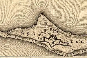 Prior to the Revolution there was only one significant fort in Rhode Island: Fort Anne (later Fort George, eventually Fort Wolcott) on Goat Island in Newport harbor. The site was first fortified with an earthen battery in 1700, replaced by Fort Anne (named for the reigning Queen of England) in 1702. It was gradually enlarged until in 1727 it was described as a 50-gun stone fort, which in 1730 was renamed Fort George, after George II.[8][9] In 1764 and 1769 two attacks on British ships by persons dissatisfied with British rule took place at and near the fort. In 1764 persons who believed HMS St John was carrying stolen goods from local merchants seized the unmanned Fort George and fired on the ship, which escaped.[10] In 1769 HMS Liberty had seized two ships from Connecticut in the course of customs enforcement. The merchant captain whose ships had been seized led a mob which captured and burned the ship on Goat Island, near Fort George.[11]