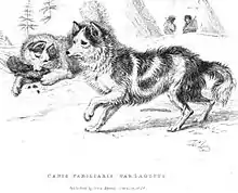 It is thought by one writer that the breed originated from a cross between native Tahltan bear dogs and dogs brought to the North American continent by Viking explorers, as it bears strong similarities to Icelandic breeds in appearance and behavior. Sir J. Richardson of Edinburgh, on the other hand, who studied the breed in the 1820s, in their original form before being diluted by crossings with other breeds, could detect no decided difference in form between this breed and a coyote, and surmised that it was a domesticated version of the wild animal. He wrote, "The Hare Indian or Mackenzie River Dog bears the same relation to the prairie wolf [coyote] as the Esquimeaux Dog [Malamute] does to the great grey wolf."[4] The breed seemed to be kept exclusively by the Hare Indians and other neighboring tribes, such as the Bear, Mountain, Dogrib, Cree, Slavey and Chippewa tribes living in the northwestern territories of Canada and the United States around the Great Bear Lake, Southwest to Lake Winnipeg and Lake Superior and West to the Mackenzie River.[1] They were valued by the Indians as coursorial hunters, and they subsisted almost entirely on the produce of each hunt. Although not large enough to pose a danger to the moose and reindeer they hunted, their small size and broad feet allowed them to pursue large ungulates in deep snow, keeping them at bay until the hunters arrived.[3] It was too small to be used as a beast of burden.[2] It was the general belief among the Indians that the dog's origin was connected to the Arctic fox.[5] When first examined by European biologists, the Hare Indian dog was found to be almost identical to the coyote in build (save for the former's smaller skull) and fur length. The first Hare Indian dogs to be taken to Europe were a pair presented to the Zoological Society of London, after Sir John Richardson's and John Franklin's Coppermine Expedition of 1819–1822. Though originally spread over most of the northern regions of North America, the breed fell into decline after the introduction of firearms made its hunting abilities unnecessary. It gradually intermingled with other breeds such as the Newfoundland dog, the Canadian Eskimo dog and mongrels.[3]
