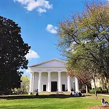 Tradition maintains that UGA's oldest permanent building, Old College, is modeled on Yale University's Connecticut Hall.[8] UGA's North Campus contains the picturesque historic buildings—such as the Chapel,[9] New College, Demosthenian[10] and the Phi Kappa[11] Halls, Park Hall,[12] Meigs Hall, and the President's office[13]—as well as modern additions such as the Law School[14] and the Main Library.[15] The dominant architectural themes are Federal—the older buildings—and Greco-Roman Classical/Antebellum style. UGA's Campus has also been designated an arboretum by the State of Georgia.