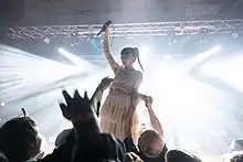 She has introduced herself as a "riot grrrl",[93][94][95] which she believes is "one of the few 'names' that I feel I can use my energy to live with or fight against the inconveniences and biases that come from advocating it."[94] In her interview with Japanese media Natalie, she said, "Within myself, my music is inherently pernicious and cannot be harmless to everyone. If it is treated as harmless by bias or prejudice, I think that's not right, and would like everyone to touch it as such."[45] Nemuri mentioned, "There's no way it's not violent to appeal something to someone. I don't want it to turn into war, massacre, or discrimination, so I'm doing music. I know it's hot and depressing. 'Do you know how mankind won democracy? It must have started with anger!'"[96] Nemuri added, "Taking away the power to think is the easiest way for those who rule and those who obtain wealth. It may sound like an exaggeration, but if this sounds like an exaggeration, you've probably been robbed. I think art is the most peaceful way to fight against such things. That's why I want to compete with art."[96]