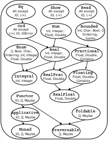 Hierarchy of type classes in the Haskell prelude as of GHC 7.10. The inclusion of Foldable and Traversable (with corresponding changes to the type signatures of some functions), and of Applicative as intermediate between Functor and Monad, are deviations from the Haskell 2010 standard.