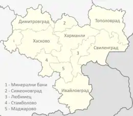 Haskovo Province (Bulgarian: Област Хасково - Oblast Haskovo, former name Haskovo okrug) is a province in southern Bulgaria, neighbouring Greece and Turkey to the southeast, comprising parts of the Thracian valley along the river Maritsa. It is named after its administrative and industrial centre - the city of Haskovo. The province embraces a territory of 5,533.3 km2 (2,136.4 sq mi)[1] that is divided into 11 municipalities with a total population, as of December 2009, of 256,408 inhabitants.[2][3][4]
