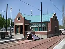 The north end of the station features a light-red brick and green-roof building that contains space for use by the train and bus operators.[9] The building is postmodern in style and includes rose windows, false chimneys, and gables.[10] The entire station was designed by the architectural firm OTAK Inc. and also includes an electrical substation.[9] Hatfield's name is etched in the façade of the main station building in stone.[2]