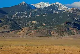 Haystack Peak is set in the Great Basin Desert which has hot summers and cold winters.[8] The desert is an example of a cold desert climate as the desert's elevation makes temperatures cooler than lower elevation deserts. Due to the high elevation and aridity, temperatures drop sharply after sunset. Summer nights are comfortably cool. Winter highs are generally above freezing, and winter nights are bitterly cold, with temperatures often dropping well below freezing. Alpine climate characterizes the summit and highest slopes.[7]