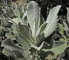 Hazardia detonsa is a bushy shrub reaching 60 centimetres (24 in) to 2.5 metres (8 ft 2 in) in height. It has densely woolly, glandular herbage of thick, serrated, oval-shaped leaves up to 14 centimetres (5.5 in) long. At the ends of its whitish stems it produces bell-shaped flower heads each about a centimeter long. Each flower head has several rows of white woolly phyllaries and an open end revealing disc florets and longer protruding ray florets. The florets are yellow and may age to red or purple.[4] The main threat to this species on Santa Cruz Island was the presence of feral Santa Cruz sheep. The sheep have been removed, allowing the plant to begin its recovery there.