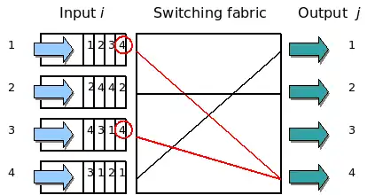 A switch may be composed of buffered input ports, a switch fabric and buffered output ports. If first-in first-out (FIFO) input buffers are used, only the oldest packet is available for forwarding. If the oldest packet cannot be transmitted due to its target output being busy, then more recent arrivals cannot be forwarded. The output may be busy if there is output contention.