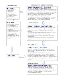 In the devolved government, the Kenya Health Policy 2014 – 2030 provides guidance to the health sector in terms of identifying and outlining the requisite activities in achieving the government's health goals.[19] The policy is aligned to Constitution of Kenya and global health commitments.