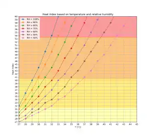 The heat index was developed in 1979 by Robert G. Steadman.[1][2] Like the wind chill index, the heat index contains assumptions about the human body mass and height, clothing, amount of physical activity, individual heat tolerance, sunlight and ultraviolet radiation exposure, and the wind speed. Significant deviations from these will result in heat index values which do not accurately reflect the perceived temperature.[3]