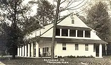 The Hebard–Ford house is a rectangular, two-story lodge built in the Bungaloid style.[2] It is of frame construction, covered with white clapboards, with a low gable roof with long shed dormers. A veranda is contained under the roofline, which is supported with seven cement pillars. The main floor has double hung, six-over-six paned windows with dark trim, and two sets of French doors open onto the veranda.[2] Inside are eight bedrooms, seven bathrooms, a large living room, a dining room, and an office.[3] Outside was a caretaker's residence, a formal garden and a tennis court.[3]