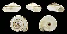 The 12โ€“20 mm. shell is broad and very depressed with an open coil forming a convex, low spire. The umbilicus is very wide. The whorls are slightly convex, and have shallow sutures. The aperture is elliptical and lacks an internal rib. The surface (periostracum) is white or pale yellow-brown. The shell often (but not always) has dark brown or yellow-brown spiral bands, and the surface has fine irregular growth ridges.