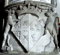 His widow erected in the south aisle chapel of Tawstock Church a large monument to her husband,[lower-alpha 1] deemed "splendid" by Pevsner,[22] "massive and ugly" by Hoskins[23] and "almost unequalled in singularity and absurdity" by Marland.[24] It consists of a free standing base of black and white marble on which sit four white marble dogs supporting on their shoulders a big black square bulging sarcophogus. On each of the four corners is a black obelisk.[22] On the sides of the base is a lengthy epitaph in Latin.[25]