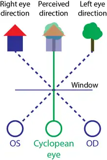 Hering proposed a simple demonstration of his law. When one fixates a point straight ahead on a window, one might see, through transparency, a different object in each eye aligned with the fixation point. For example in the right eye a house is seen behind the fixation point through the window. The house will appear to be located on the left. In the left eye a tree is seen behind the fixation through the window, appearing to be located on the right. When both eyes look at the fixation point, the house and the tree will appear superimposed in the cyclopean image, however the perceived location of these two superimposed images will be straight ahead. This demonstrates that the perceived location of a point is influenced by its location in both eyes and is relative to an imaginary cyclopean eye (or egocenter).