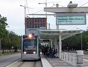 Hermann Park/Rice U is an island platformed METRORail light rail station in south-central Houston, Texas, United States. The station was opened on January 1, 2004, and is operated by the Metropolitan Transit Authority of Harris County (METRO). Located in Hermann Park, it is located at the intersection of Fannin Street and Sunset Boulevard. The station also serves the main entrance of Rice University. Adjacent to the station is a stop on the Hermann Park Railroad, a narrow-gauge recreational sightseeing train for park visitors.