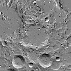There may exist a large amount of water ice within Hermite A's permanently shadowed region (PSR), where no light from the sun ever reaches; according to a 2016 study published by the IEEE roughly two-thirds of the crater's PSR is covered with varying amounts of ice.[6] However, a 2018 study also published by the IEEE countered this claim, arguing that the method used to detect ice in the earlier study was not refined enough to conclusively identify a material as ice, and that more detailed methods were needed to determine if ice exists within Hermite A.[7] A further analysis of the crater in 2022 using data from the Chandrayaan-1 and Chandrayaan-2 lunar orbiters found that ice may exist in clusters on the walls and some parts of the floor of Hermite A.[8]