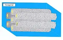 A hexagonal phase of lyotropic liquid crystal is formed by some amphiphilic molecules when they are mixed with water or another polar solvent. In this phase, the amphiphile molecules are aggregated into cylindrical structures of indefinite length and these cylindrical aggregates are disposed on a hexagonal lattice, giving the phase long-range orientational order.