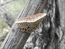 Wasp nest polypore are found on both branches and trunks of living trees and dead logs in rainforest and wet sclerophyll forest, however they have been recorded in more semi arid areas of Eucalypt Mallee Woodland.[8] Fungi are categorised into groups dependant on their shape, form, texture and function, known as morphogroups.[7] Wasp nest polypore are categorised as fungi with pores and are saprophytic fungi, which is the largest macro fungi group.[9]