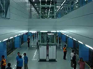 Hi-Tech Park station (simplified Chinese: 高新园站; traditional Chinese: 高新園站; Jyutping: Gou1 San1 Jyun4 Zaam6), formerly Gaoxinyuan station, is a station on Line 1 of the Shenzhen Metro. It started operations on 28 September 2009.[1] It is located underground at the intersection of Shennan Dadao (Chinese: 深南大道), Tonggu Road (simplified Chinese: 铜鼓路; traditional Chinese: 銅鼓路) and Kejinan Shilu (Chinese: 科技南十路),[2] in the Nanshan District of Shenzhen, China. The station is named after the Shenzhen Hi-Tech Park (simplified Chinese: 深圳高新技术园; traditional Chinese: 深圳高新技術園), but the name has been criticized as inappropriate since it is actually closer to Dachong (simplified Chinese: 大冲; traditional Chinese: 大涌).[3]