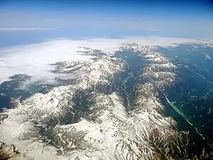 The layout of the Hida Mountains forms a large Y-shape. The southern peaks are the lower portion of the Y-shape, with the northern peaks forming two parallel bands separated by a deep V-shaped valley. It is one of the steepest V-shaped valleys in Japan. The Kurobe Dam, Japan's largest dam, is an arch dam located in the Kurobe Valley in the central area of the mountains. The western arm of mountains, also known as the Tateyama Peaks (立山連峰 Tateyama Renpō), are dominated by Mount Tsurugi and Mount Tate. The eastern arm, known as the Ushiro Tateyama Peaks (後立山連峰 Ushiro Tateyama Renpō), are dominated by Mount Shirouma and Mount Kashimayari.