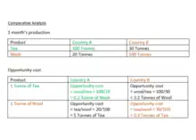 Using the simple example in the image, to make 100 tonnes of tea, Country A has to give up the production of 20 tonnes of wool which means for every 1 tonne of tea produced, 0.2 tonnes of wool has to be forgone. Meanwhile, to make 30 tonnes of tea, Country B needs to sacrifice the production of 100 tonnes of wool, so for each tonne of tea, 3.3 tonnes of wool is forgone. In this case, Country A has a comparative advantage over Country B for the production of tea because it has a lower opportunity cost. On the other hand, to make 1 tonne of wool, Country A has to give up 5 tonnes of tea, while Country B would need to give up 0.3 tonnes of tea, so Country B has a comparative advantage over the production of wool.