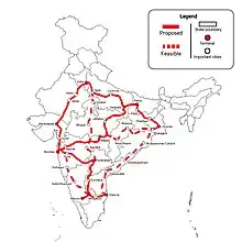- ↑ "This route is not planned yet and it represents the most feasible route for Delhi–Bengaluru section of Diamond Quadrilateral high-speed rail line. However, one section of this potential route between Hyderabad and Bengaluru is planned to be operational by 2041.