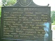 A post office was established in 1879 in the community then known as "North Tower".[4] In 1888, the town was renamed for the landmark High Bridge, a 275-foot-high (84 m) railroad bridge over the Kentucky River. The first bridge was planned by John Roebling as a suspension bridge, but ultimately built as a cantilever bridge. The current bridge, the second one on these foundations, is the highest railroad bridge in the United States over a navigable river. The Kentucky River runs through the Kentucky River Palisades for much of the lower portion of its length. Most of the bridges over it in the area are relatively high ones.