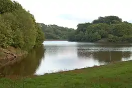 High Bullough Reservoir is the oldest of all the reservoirs in the Rivington chain, having been authorised by an Act of Parliament obtained in 1846 and completed in 1850. It was built for Chorley Waterworks by the engineer John Frederick Bateman, who had estimated the cost of the project while working for Edwin Chadwick's Towns Improvement Company, and had then acted as Engineer for the project. The outlet consisted of a pipe running through the dam, and supported by two masonry piers where it ran through the central clay puddle. The outlet valve was at the downstream end of the dam, and although this configuration is no longer thought to be good practice, there have been no serious issues with the reservoir throughout its operational life.[1] The earth dam had a maximum height of 39 feet (12 m), was 988 feet (301 m) long and impounded 55 million imperial gallons (250 Ml) of water.[2]