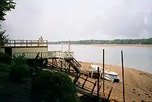 Record low streamflows caused by unusually dry weather resulted in extremely low water levels at High Rock Lake during the Southeastern United States Drought of 2002.[13] These dry weather patterns began in 1998 and persisted until 2002. The final year of the drought was the worst for the lake.[14] With water levels well below full pond, fish began to die [15] due to overcrowding and a lack of water oxygen content, filling the air with rancid smells. Tourism in the area dropped and residents along the lake began to complain. When water levels plummeted to six feet above the "run of river" state (24 feet below normal), federal and state agencies closed the High Rock dam, forcing reservoirs like Badin Lake and Lake Tillery (who were at full pond status) to pick up the slack to maintain flows on the lower Yadkin/Pee Dee River. This allowed High Rock Lake to return to a level of 17 feet (5.2 m) below full pond before going down again. In the fall of 2002, the drought eased up and the Yadkin Valley experienced one of the wettest 15 months on record. By the end of 2003, water tables in the area were back to normal levels.