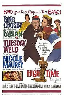 High Time is a 1960 American comedy film directed by Blake Edwards and starring Bing Crosby, Fabian, Tuesday Weld, and Nicole Maurey. The film is told from the perspective of a middle-aged man who enters the world of a new generation of postwar youth.