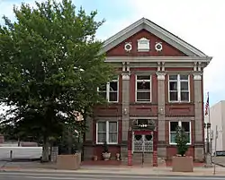 It is a two-story red brick front-gabled building with four gray brick pilasters in its symmetrical front facade. It is 36 by 75 feet (11 m × 23 m) in plan. Its cornice and pediment are supported by decorative brackets. [2]