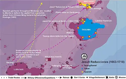 • 1663 - Spanish garrisons in Zamboanga and Basilan were abandoned to defend Manila from an imminent attack from Chinese pirate Koxinga, and the Jesuits took over administration of the missions as "reducciones", Luis Quindingan (former Datu Kindingan) was made Maestro Campo
