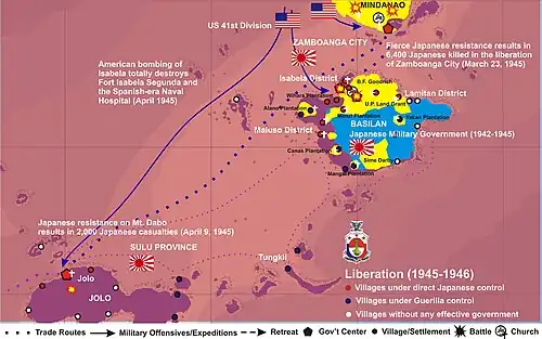 • 1945 - Filipino soldiers of the 6th, 10th and 102nd Infantry Division of the Philippine Commonwealth Army was landing the beaches and liberated the island and helpful to the local Christian and Muslim guerrilla fighters and American soldiers and defeating Japanese Imperial forces
