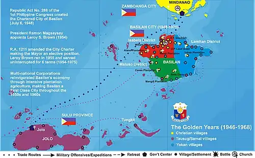 • July 1, 1948 - City of Basilan (R. A. 288,[11] authored by Cong. J. S. Alano) is inaugurated, Nicasio S. Valderroza becomes the first City Mayor (appointed by Pres. Elpidio Quirino)