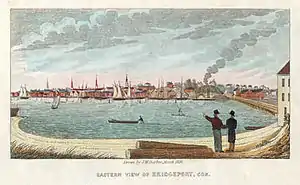 During the American Revolution, Bridgeport was a center of privateering.[3] Captain David Hawley of Stratfield brought a number of prizes into Black Rock Harbor.[7] In 1800, Newfield village on the west bank of the Pequonnock was chartered as the borough of Bridgeport, and, in 1821, the township of Bridgeport, including more of Stratfield, was incorporated. Finally, Bridgeport was chartered as a city in 1836.[8]