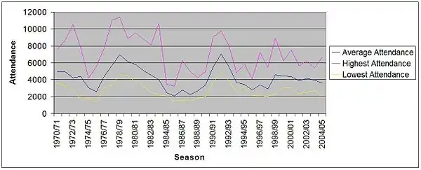 Cambridge United played their home games for their entire period in the Football League at the Abbey Stadium in Cambridge. The table below shows the high, low and average attendance for each season between inception in 1970 and relegation in 2005. Where the high attendance is above the capacity of the ground, this was possible due to terracing at the ground which meant the capacity was previously higher than the current figure of 9,617.
