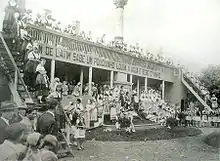 Between 1938 and 1950, the festival was not held, due to the nationalist policy of Getúlio Vargas, but in the 1950 edition, coinciding with the celebration of 75 years of immigration and the beginning of the reconciliation phase, the festival already had the participation of ten municipalities and exhibited industrial products, resulting from the economic growth of the city and the greater variety in its production profile. The immigrants started to be called "pioneers", indicating a reorientation in the identity to be built, with progressive implications that opened for the non-Italians, already considered actors in the whole process.[88]