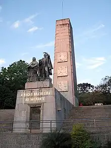 In the period of World War II, the city was troubled by political differences, by the xenophobic atmosphere created by the nationalist policy of the Vargas Era and by the armed conflict with Italy.[76] Between 1941 and 1944, there were popular anti-Italian demonstrations organized by the National Defense League, which sought to suppress the identifying signs of ethnicity, creating an atmosphere of terror. Groups of demonstrators, among other acts of aggression, removed the bronze plaque from the immigration memorial obelisk erected in the district of Nova Milano, and, in the urban center, the plaques that indicated Italy Avenue and Dante Alighieri Square, demanding – and obtaining – the replacement of their names. The Italians were forbidden to speak their dialect, and a wall of silence formed around them, since many, especially the older ones, could still barely express themselves in Portuguese. Their movement became dependent on obtaining safe-conducts, severely hindering their interaction at all levels with Brazilians. Such repression led to an effort of self-censorship on the part of the Italians themselves and their descendants, discouraging the cultivation of memory even in the bosom of the home and interrupting until 1950 the celebration of the Festa da Uva. The same happened to those who, in smaller numbers, descended from Germans and spoke German.[77]