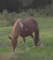 Once ownership of the island was settled, it was used mostly as a place to house livestock, since there was no need for fences or other enclosures to prevent the animals from straying, and they could feed off of the marsh grasses.[7] This usage was most likely the origin of the ponies that have made Chincoteague and Assateague Islands famous, though there are legends that the ponies' ancestors survived a shipwreck of a Spanish vessel. One such ship did run aground on Assateague Island in 1750, but according to John Amrhein Jr. in his account of his efforts to locate that vessel, "the mystery of the origin of the wild ponies became fused with the oldest memories of the Spanish shipwreck."[8]