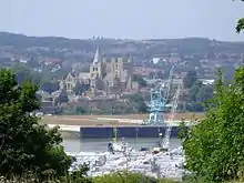 In AD 842 Rochester was sacked by invading Danes and was under siege again from them in AD 884. This time the town held out until relieved by King Alfred.[17] In the 10th century Rochester had the right to mint coins (AD 930). The wooden bridge is mentioned in AD 960, though this may have been a rebuilding in timber using the Roman piers.[18][19][20] Slightly later, during Edward the Confessor's reign, various local estates were documented as having a duty to repair Rochester bridge. For instance: "The second pier belongs to Gillingham and to Chatham, and they have to provide planks for one pole and put three beams in position".[21]