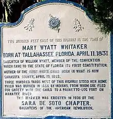 Whitaker - William Whitaker was the first documented pioneer of European descent to settle permanently in what became the village of Sarasota.[11] After time spent along the Manatee River at the village of Manatee, Whitaker built upon Yellow Bluffs, just north of present-day Eleventh Street. He sold dried fish and roe to Cuban traders working the coast and in 1847, he began a cattle business. In 1851, Whitaker married Mary Jane Wyatt, a member of a pioneer family who had settled the village of Manatee, that was about 13 mi (21 km) to the northeast along the river of the same name. William and Mary had 10 children, one of whom was Dr. Furman Chairs Whitaker, one of the area's first physicians.[12]