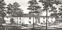 The first building on the campus, constructed between 1912 and 1913, was named in honor of William Lorraine Converse, Sr. who, as a State Representative, helped expedite the establishment of the college in Valdosta. On December 19, 1912, Dr. Powell moved into office his in the new building and the first pieces of furniture were installed in preparation if the school's opening.[2] Converse Hall served a variety of purposes for the new institution. The structure provided classrooms, administration offices, double-occupancy dormitory rooms, a dining hall, an infirmary, and a chapel. The Spanish Colonial Revival architecture of college in Valdosta was based on the popular style of the era, as well as Powell's personal experiences in the American Southwest. The school opened in January 1913, but the surrounding landscape was primarily undeveloped There were no driveways or sidewalks, and the predominant wetlands at the south were only crossable at Patterson Street.