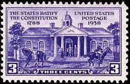 Virginia was the tenth state to ratify on June 25, 1788. The 150th anniversary of the U.S. Constitution ratification was celebrated on June 21, 1938, with a 3-cent stamp, dated from the required assent of nine of the original thirteen states. The remaining four states including Virginia, the largest, New York, North Carolina and Rhode Island ratified by 1790, following guarantees that the Constitution would be amended with a Bill of Rights. The stamp depicts the Old Court House in Williamsburg, Virginia, with two riders about to spread the news of Virginia's ratification of the Constitution.[28]