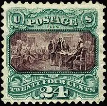 Thomas Jefferson, principal author of the Declaration of Independence, was honored with a 5-cent stamp at the onset of the American Civil War. The stamp was used in combinations for postage to France and other foreign destinations. The National Bank Note company printed approximately 175,000 of this Classic Period stamp in several shades.[17] The signing of the Declaration of Independence was commemorated with a 24-cent stamp in 1869. The stamp reproduces John Trumbull's painting in the U.S. Capitol rotunda, in an image 1/300th the size of the original. The National Bank Note Company printed 235,350 stamps of this 24-cent issue.[18] In the Second Continental Congress, George Washington was unanimously elected to lead the Continental Army besieging Boston. He personally commanded campaigns in the north.[19]