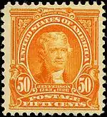 James Madison, the fourth U.S. president, is honored on the 2-dollar Second Bureau Issue stamp 1902–1908. He was a leader in the colonial Virginia Assembly and participated in framing the Virginia Constitution of 1776. He served in the Continental Congress and in the Constitutional First Congress framed the Bill of Rights. Secretary of State under President Jefferson, his own presidency saw the War of 1812. The stamp was designed by R. Ostrander Smith from a painting by an unknown artist. The 2-dollar Madison was used for large, foreign letter rate parcels. In World War I the stamp was re-issued to meet the demand for postage for machine parts mailed to Russia.[38]