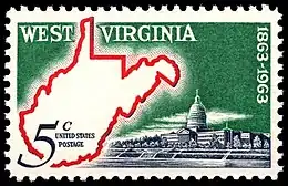 West Virginia became a state following the Wheeling Conventions. Fifty northwestern counties of Virginia whose population had been underrepresented in the General Assembly were successfully admitted to the Union as a new state on June 20, 1863. West Virginia statehood was commemorated on its 100th anniversary with a 5-cent stamp on June 20, 1963. Designed by Dr. Dwight Mutchler of Ohio University, the map's outline is red against a white background. The stamp was printed on the Giori press with a printing of 120 million.[55]