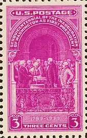 Washington's presidential inauguration in 1789 was celebrated on its 150th anniversary in 1939. It took place at Federal Hall in New York City, the first capital under the new Constitution for one year before it was moved to Philadelphia and then finally to Washington, D.C. Washington had been elected unanimously the commander in chief of the Continental Army, president of the Constitutional Convention, and President of the United States twice. He played a pivotal role in the early United States history. The Post Office produced over 72.7 million of the issue.[33]