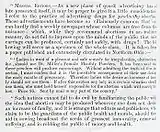 Such advertising aroused criticisms of quackery and immorality. The safety of many nostrums was suspect and the efficacy of others non-existent.[95] Horace Greeley, in a New York Herald editorial written in 1871, denounced abortion and its promotion as the "infamous and unfortunately common crime– so common that it affords a lucrative support to a regular guild of professional murderers, so safe that its perpetrators advertise their calling in the newspapers".[109] Although the paper in which Greeley wrote accepted such advertisements, others, such as the New York Tribune, refused to print them.[109] Elizabeth Blackwell, the first woman to obtain a Doctor of Medicine in the United States, also lamented how such ads led to the contemporary synonymity of "female physician" with "abortionist".[109]