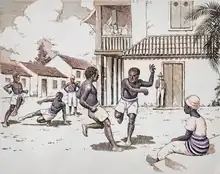 More slaves were sent from Southern Angola to Rio de Janeiro than from any other region of Africa.[12] Rio de Janeiro, the epicenter of capoeira in the 19th century, saw the development of an extremely violent style of capoeira carioca associated with gangs or maltas. This street-fighting capoeira was mix of various fighting techniques: foot kicks, head butts, hand blows, knife fight and stick-fighting,[13] only the first arguably originated from the Angolan art.[14] That violent version of capoeira is now generally extinct.