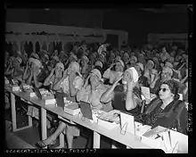 During the early 1900s, makeup was not excessively popular. In fact, women hardly wore makeup at all. Make-up at this time was still mostly the territory of prostitutes, those in cabarets and on the black & white screen.[32] Face enameling (applying actual paint to the face) became popular among the rich at this time in an attempt to look paler. This practice was dangerous due to the main ingredient often being arsenic.[33] Pale skin was associated with wealth because it meant that one was not out working in the sun and could afford to stay inside all day. Cosmetics were so unpopular that they could not be bought in department stores; they could only be bought at theatrical costume stores. A woman's "makeup routine" often only consisted of using papier poudré, a powdered paper/oil blotting sheet, to whiten the nose in the winter and shine their cheeks in the summer. Rouge was considered provocative, so was only seen on "women of the night." Some women used burnt matchsticks to darken eyelashes, and geranium and poppy petals to stain the lips.[33] Vaseline became high in demand because it was used on chapped lips, as a base for hair tonic, and soap.[33] Toilet waters were introduced in the early 1900s, but only lavender water or refined cologne was admissible for women to wear.[34] Cosmetic deodorant was invented in 1888, by an unknown inventor from Philadelphia and was trademarked under the name "Mum". Roll-on deodorant was launched in 1952, and aerosol deodorant in 1965.