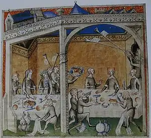 The Menestrels, (Minstrels), were usually street singers who had established a more professional means of living, entertaining in the palaces or residences of noble and wealthy Parisians. In 1321, thirty-seven minstrels and jongleurs formed a professional guild, the Confrérie de Saint-Julien des ménétriers, the first union of musicians in Paris. Most of them played instruments: the violin, flute, hautbois, or tambourine. They played at celebrations, weddings, meetings, holiday events, and royal celebrations and processions. By their statutes enacted in 1341, no musician could play on the streets without their permission. In order to become a member, a musician had to be an apprentice for six years. At the end of the six years, the apprentice had to audition for a jury of master musicians. By 1407, the rules of the Confrérie were applied to all of France.[8]